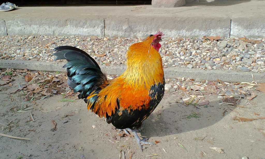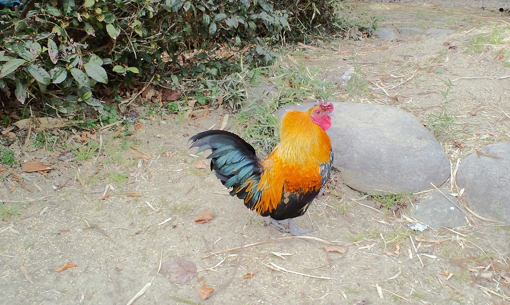 守護役の鶏。(種類不明?)堂々としてカメラに収まってくれました。