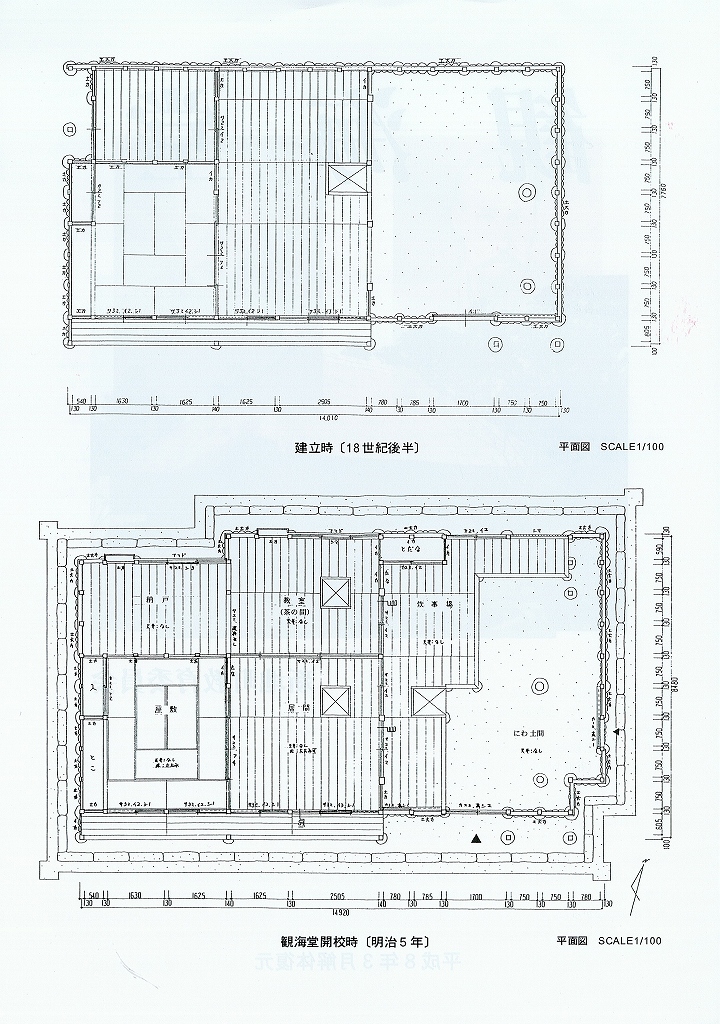は、平成7年度解体復元を行っているが、その際、梁より「明和6年」(1769)という墨書が発見され、建物が建てられた年代を知る上で重要な証拠となった。今回の復元は、学校設立当初の姿に戻すため、明治初年このの形を復元した。』町教育委員会