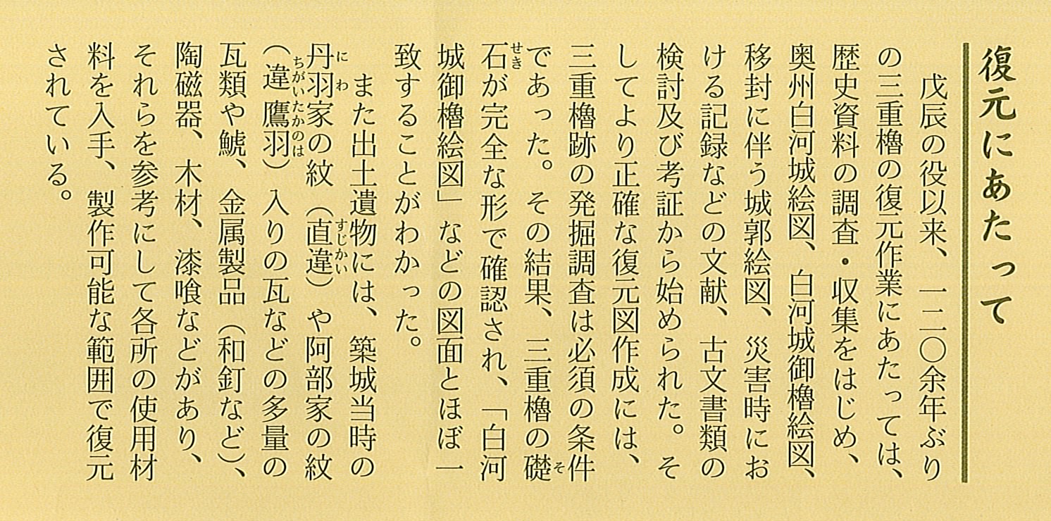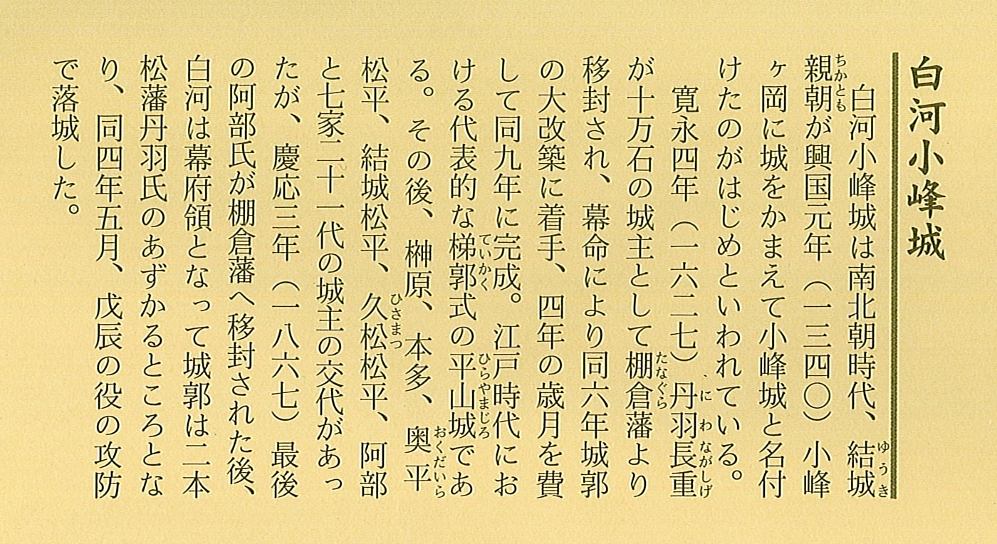 小峰城 白河市 小峰城は別名「白河城」と呼ばれ、築城は、南北朝時代の1340年(南朝:興国元年、北朝:暦応3年)に、結城親朝が小峰ヶ岡に築城して 小峰城と名づけたのが始まりとされています。 城主の白河結城氏が、豊臣秀吉の小田原の陣へ参陣しなかった事から奥州仕置により 改易させられ、その後は会津領となって、蒲生氏や上杉氏が城代を置き支配しました。本丸には三重櫓をはじめ櫓門などの建物を配し、 会津若松市の鶴ヶ城などとともに日本100名城にも選定されています。 幕末の戊辰戦争の時には奥羽越列藩同盟軍と新政府軍との激戦地となり多くの建物が消失し、現在のものは、1991年に復元されました。