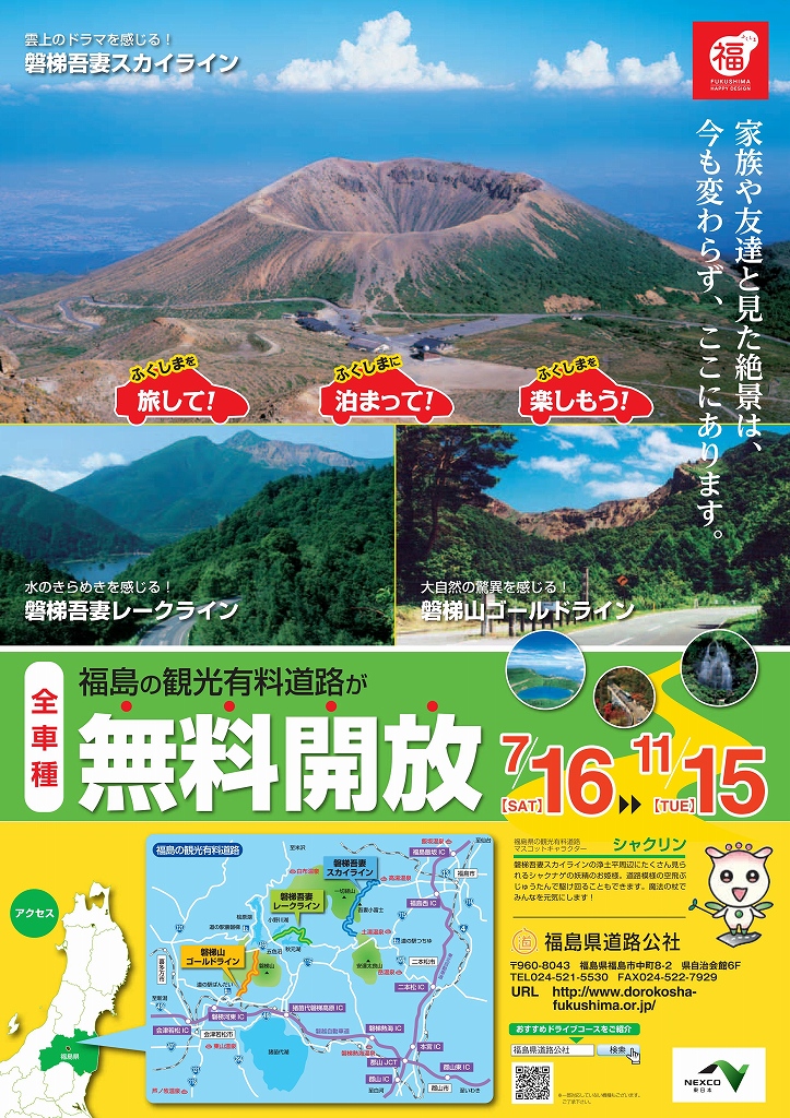 磐梯吾妻スカイライン、レークライン、ゴールドラインが無料化されます。http://www.dorokosha-fukushima.or.jp/pdf/muryopr.pdf
