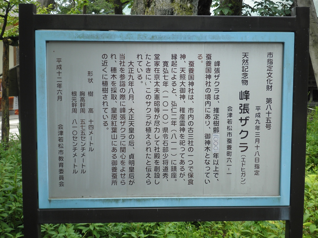 峰張ザクラは、推定樹齢1000年以上で、蚕養国神社の御神木となっている。蚕養国神社は、市内の古三社の一つで保食神、天照大御神、稚産霊神を祀ってあるが、縁起によると、弘仁2年(811)に鎮座。寛弘7年(1010)県令石部少将道秀、堂家在京太夫憲昭等が尽力して社殿を創設したときに、このサクラが植えられたと伝えられている。大正9年8月、大正天皇の后、貞明皇后が当社を参詣の際に峰張ザクラに関心をよせられ、穂木を採取、皇居紅葉山にある御養蚕所の近くに植樹されている。樹高:14m、胸高幹周5.74m、根元幹周8.1m 平成12年6月 会津若松市教育委員会