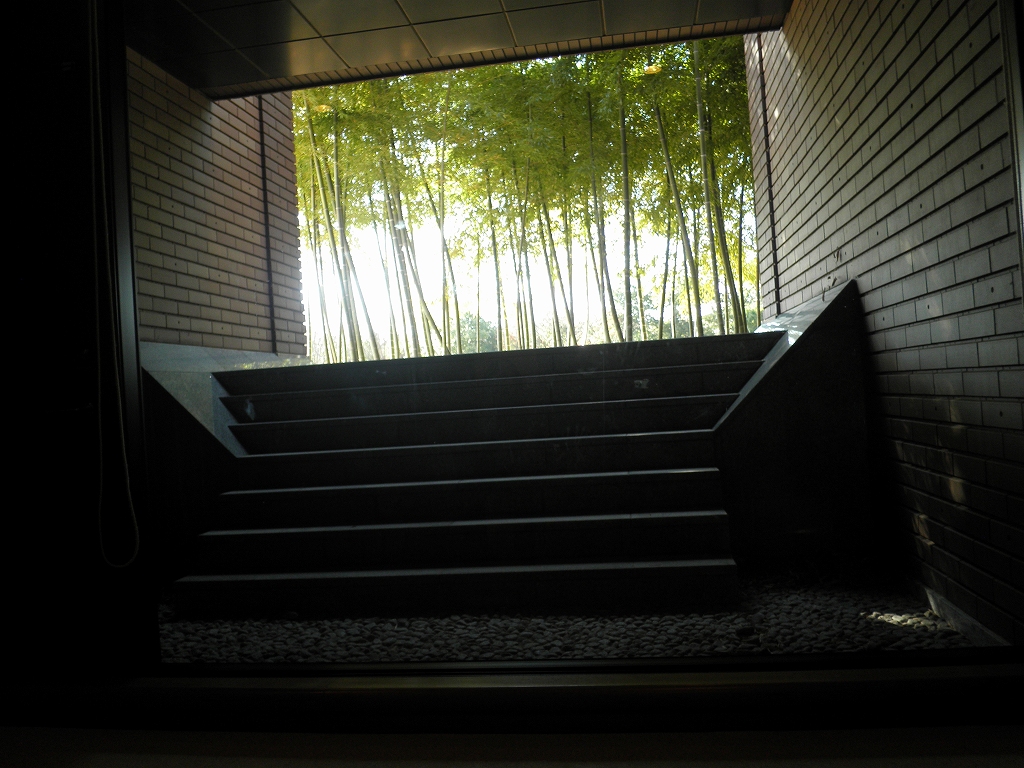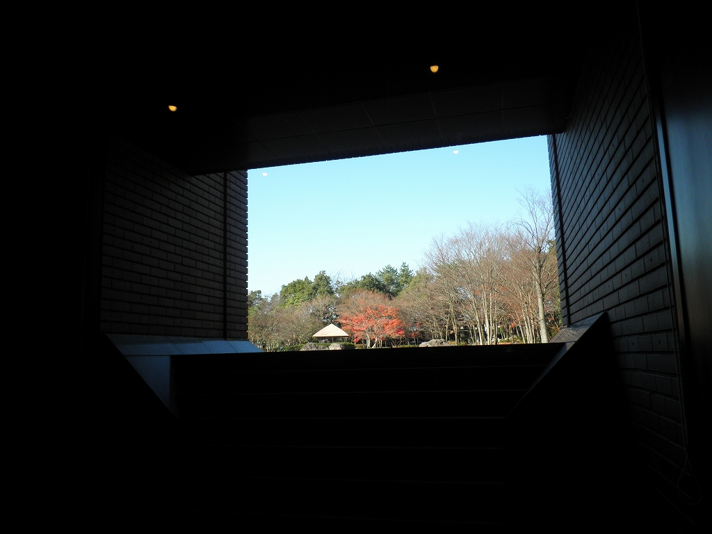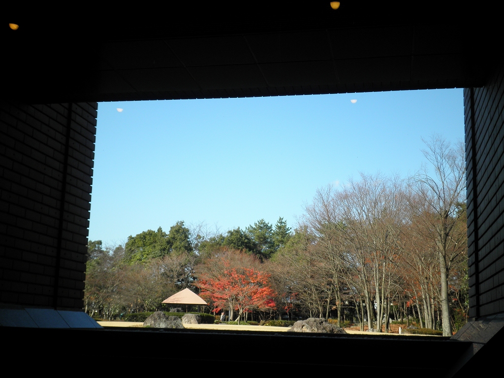 福島県立美術館で 休憩室の窓・・・絵画の設えになっており、紅葉は見事だろう。 風に舞って飛んできた"けさらんぱさらん"