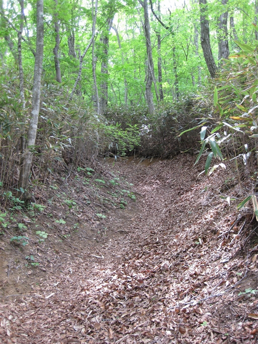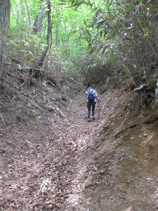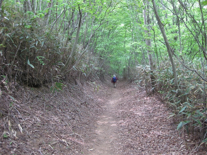 距離は短く30分ほどですが、かなり勾配が急峻です。登りは新道(巾員約4m未舗装)で、下りは旧道(けもの道+α)を通ると落ち葉のクッションがあり以外に楽かもしれませんよ。