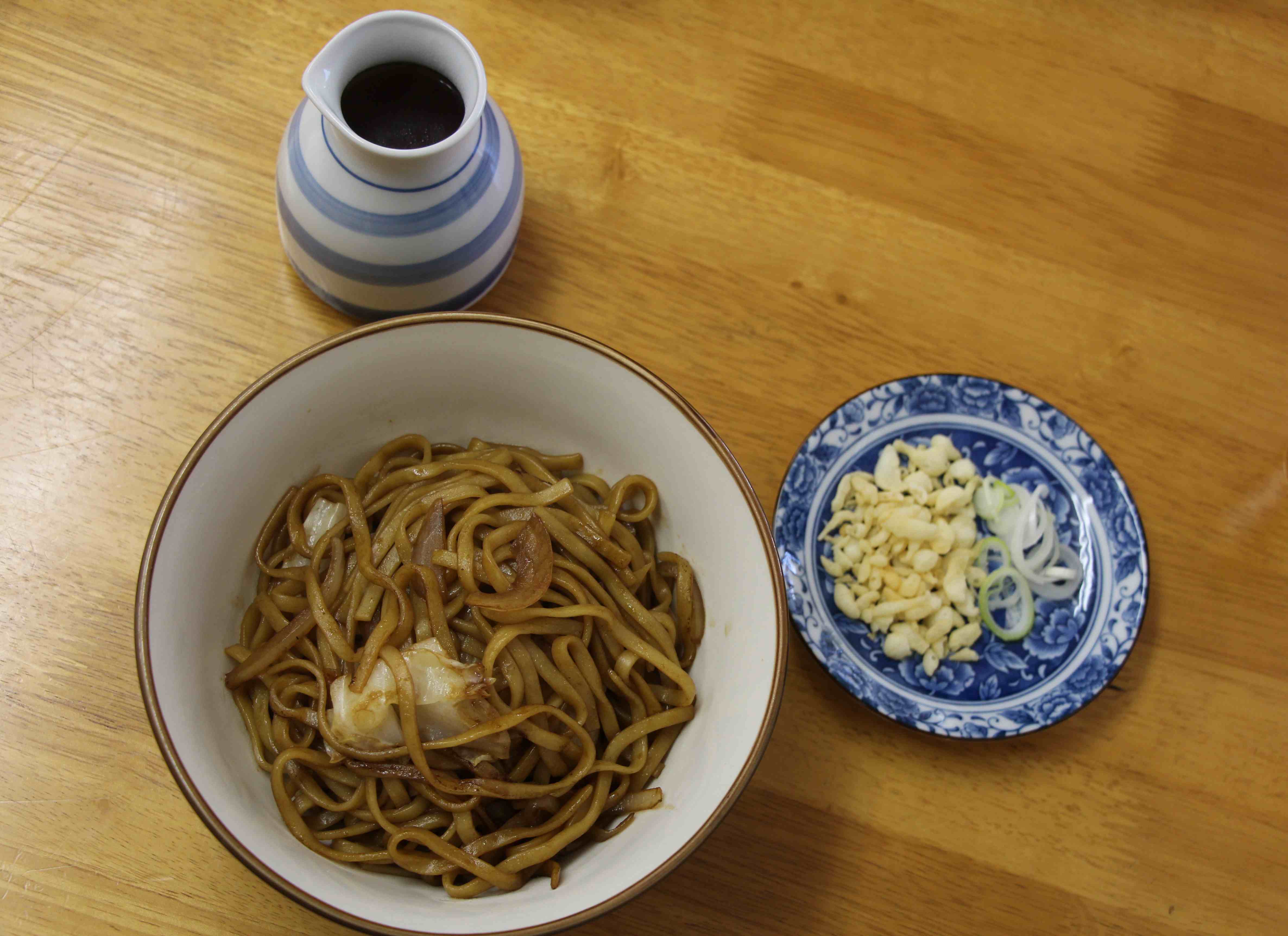 まずは普通の焼きそばで、つゆ+ウスターソース+一味唐辛子で2度美味しい