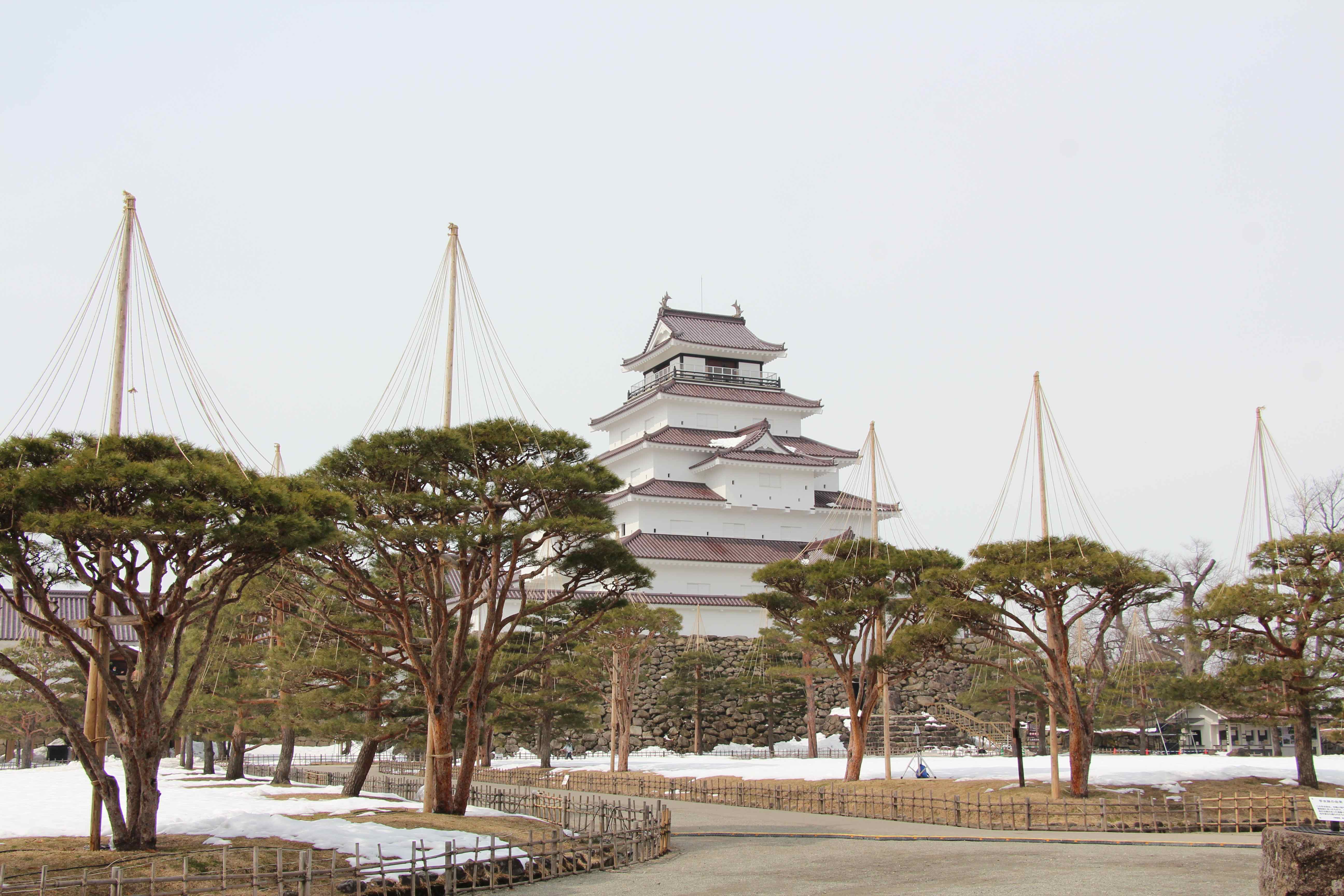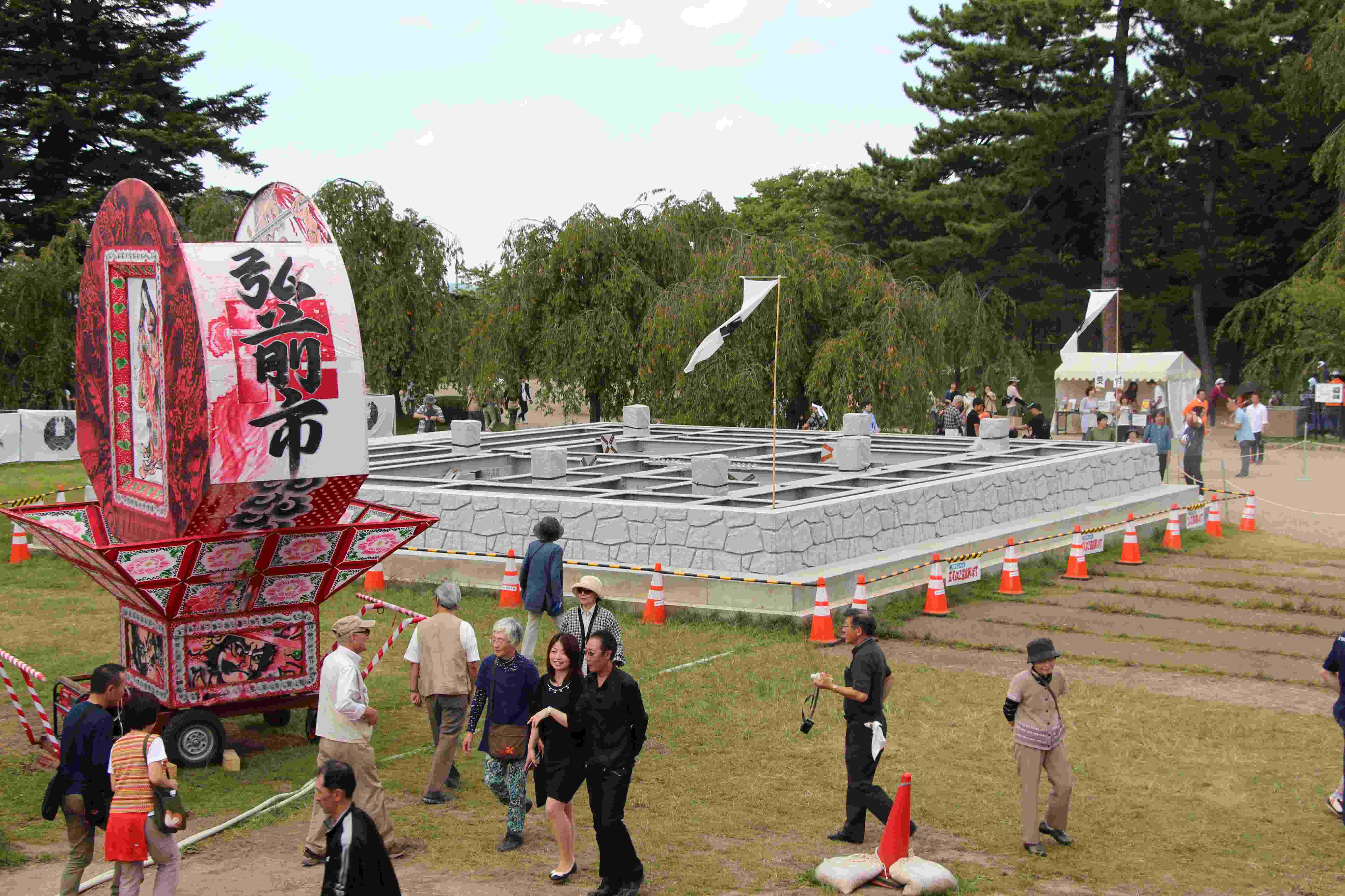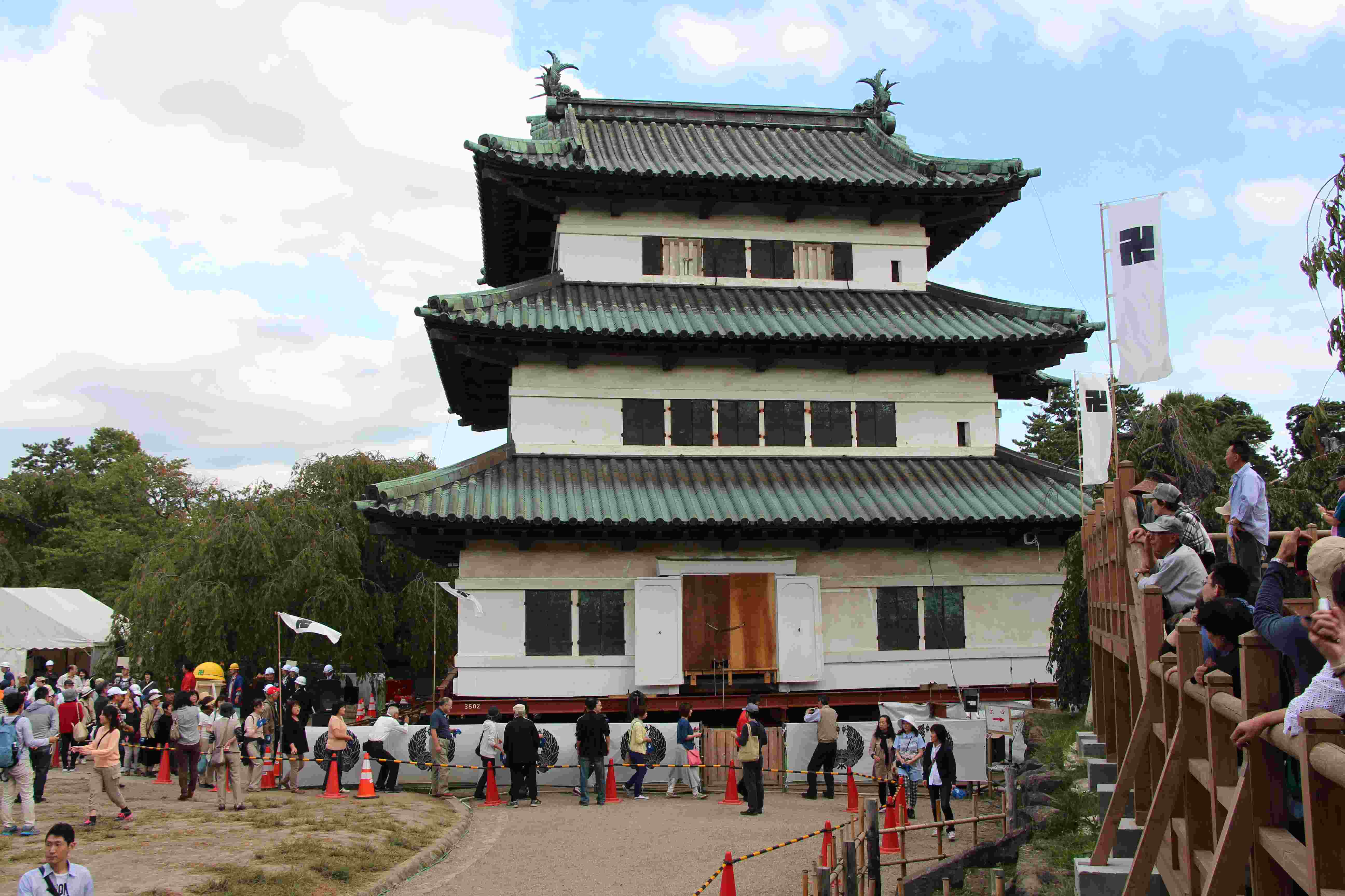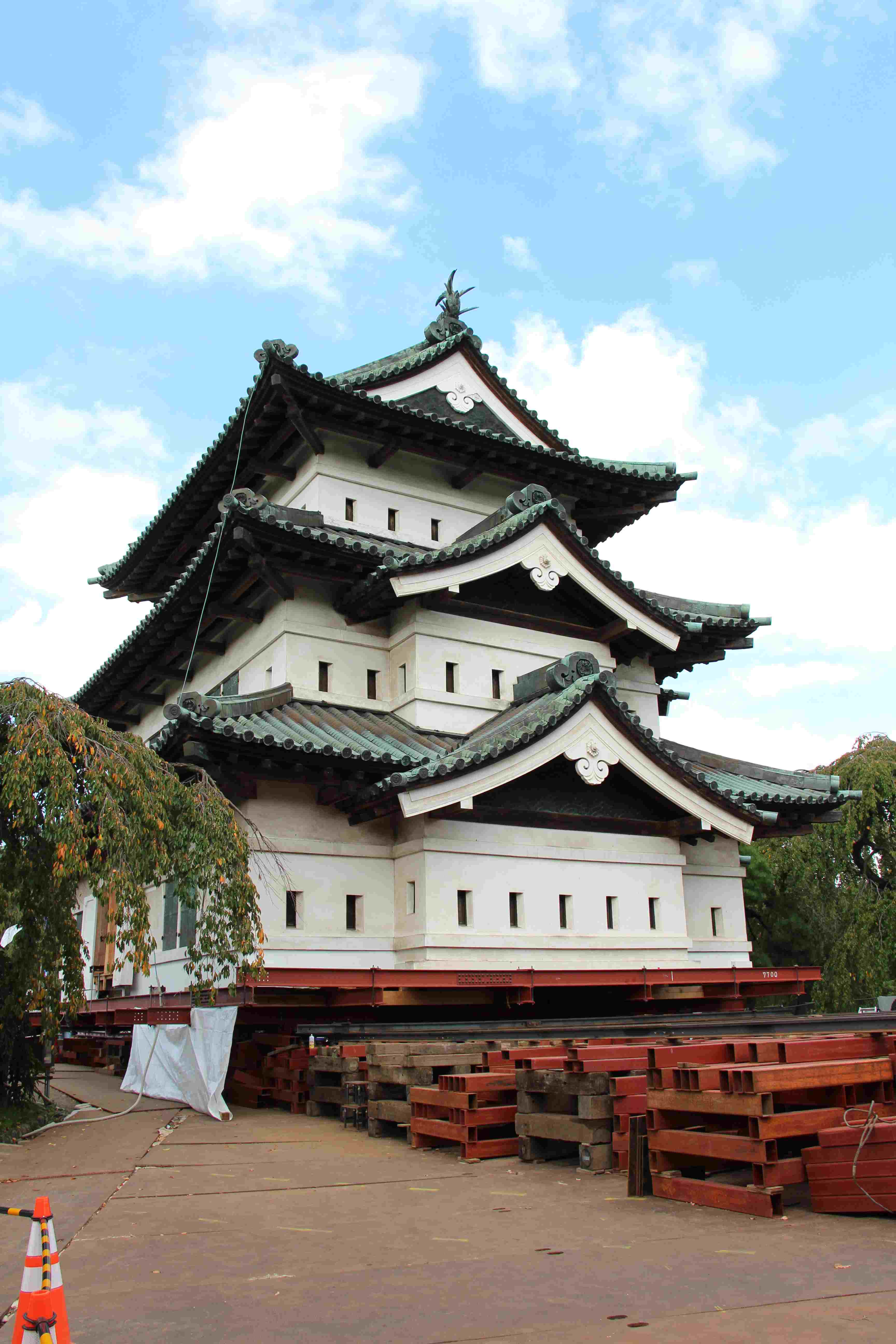 重要文化財「弘前城」 史跡 津軽氏城跡「弘前城」昭和27年3月29日史跡指定 弘前城は、津軽藩主代々の居城で慶長十六年(1611)に二代藩主津軽信枚によって築かれた城である。 面積約492,000㎡(約14万9千坪)を有し、本丸、二の丸、三の丸、四の丸、北の郭、西の郭の六郭よりなり、三重の濠と土塁でめぐらされた城郭である。 現在城跡には、天守閣をはじめ隅櫓三棟、城門五棟の建造物が残されおり、いずれも重要文化財に指定されている。 天守閣は、石垣修復のため曳家工法により仮設土台まで移動中であり、人力曳家の体験が行われている。 755.5+426.0㎞