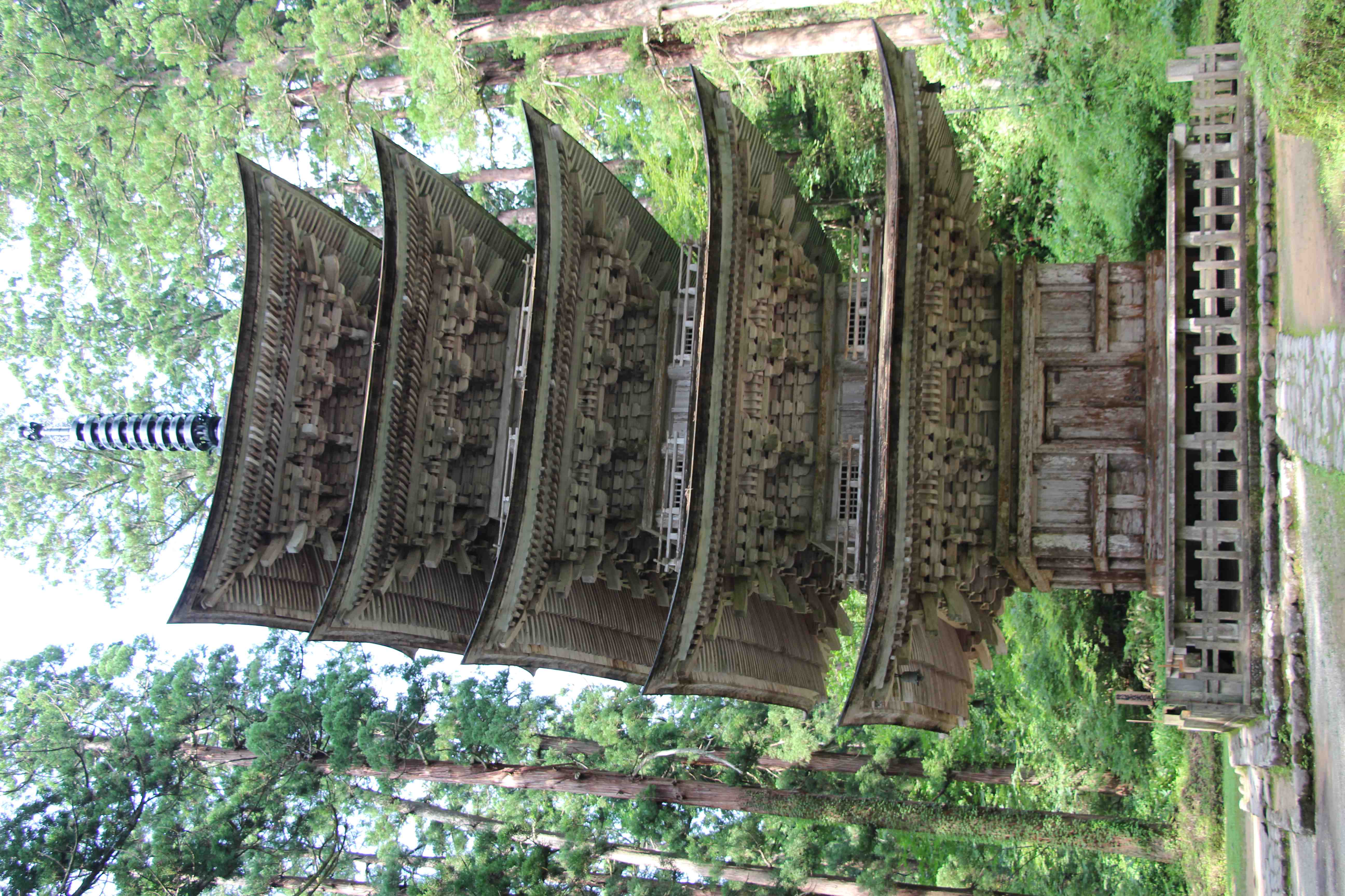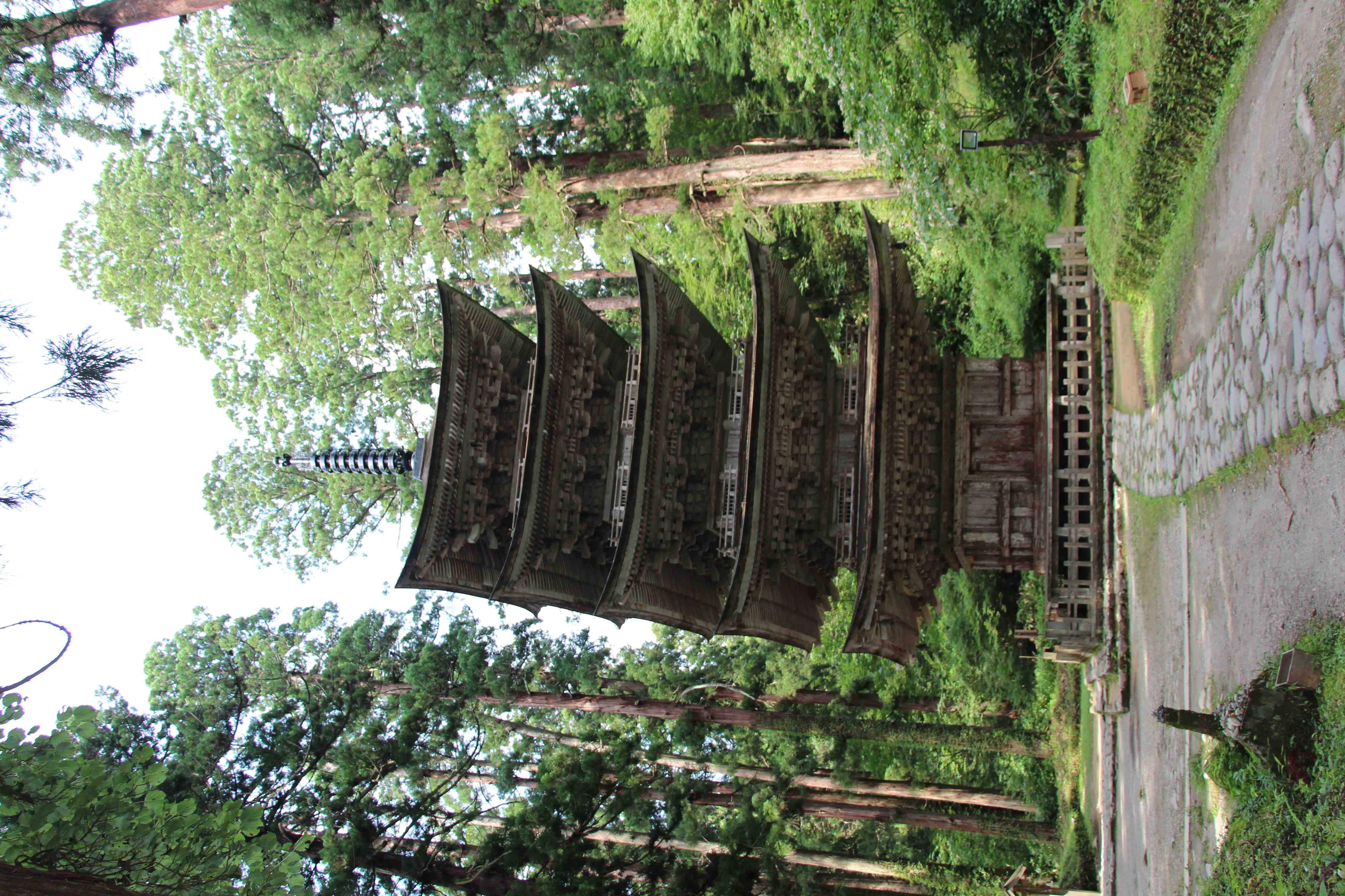 羽黒山参道杉並木の「一の坂」にある。平将門の創建と伝えられ、東北地方では最古の塔といわれる。現在の塔は1372~4年に再建されたものと伝えられ、高さ29.4mの3間五層柿葺素木造で、昭和41年国宝に指定された。近くには推定樹齢千年、根回り10.5mの巨杉「爺スギ」がある。