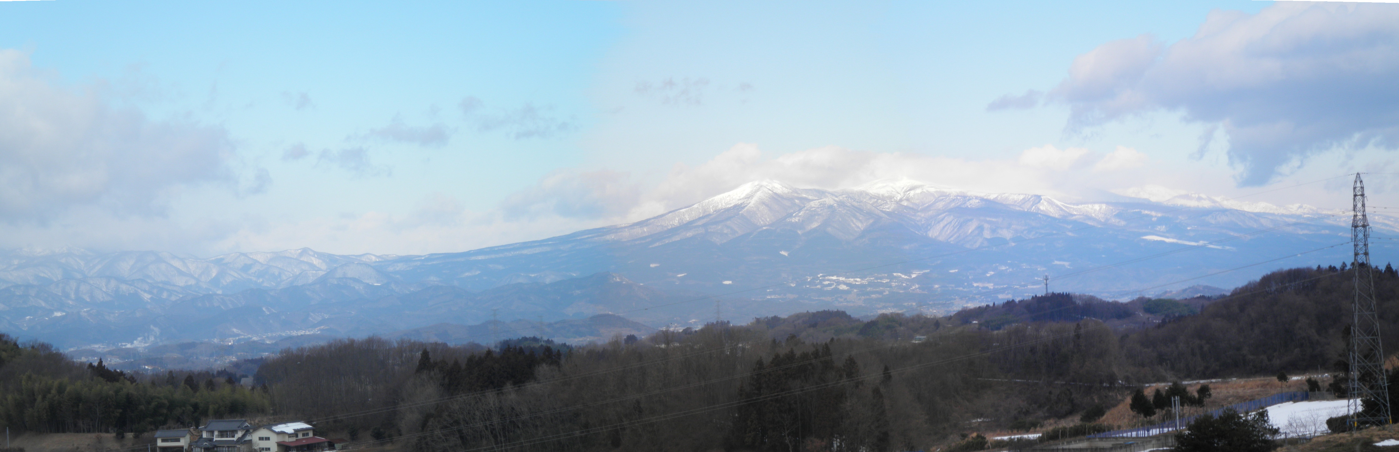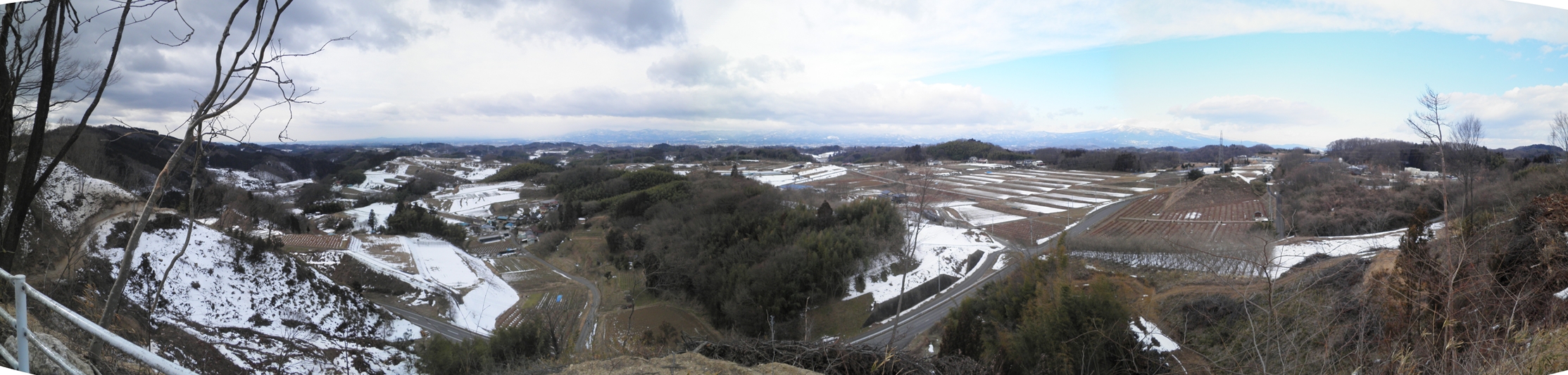 三春ダム(さくら湖)2013.2.22 西方館跡からの眺望(360度大PANORAMA) 戦国田村氏時代の舘跡で千葉紀伊守の居城といわれる東に大滝根川南西は急崖の要害の地で山すそにある行井戸より立昇る 霧がこの城にたなびえて神霊を崇めて霧舘と称した。峯つづきにある妙見は城の守護神であるという -中妻文化財を守る会-